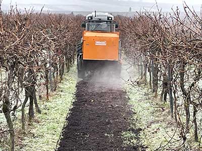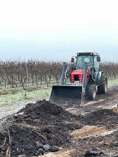 Jetzt, im Januar, ist eine gute Gelegenheit, den Trester in den Weinbergen zum Bio-Recycling auszubringen. Wenn der Boden gefroren ist, fährt man mit dem Traktor keine tiefen Spuren in die Rebzeilen und kann das Material gut ausstreuen.