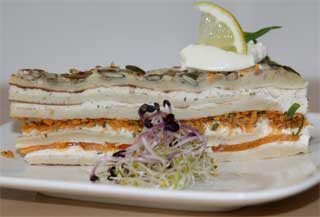 Schichttorte mit Spundekäsmasse und Räucherforelle