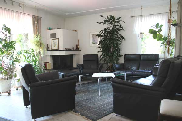 Der moderne Teil des Empfangs- und Probierraums hat einen Kamin und bietet einen schönen Blick in den Garten.
