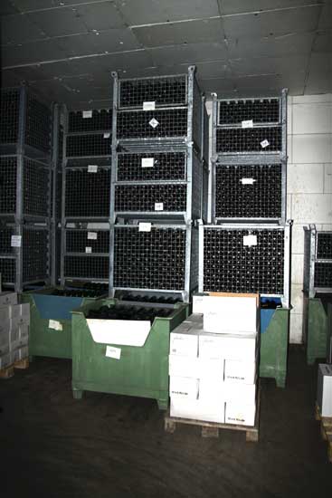 Unetikettierte Weine lagern wir in Gitterboxen, bis sie ausgestattet werden. Das Flaschenlager ist klimatisiert.