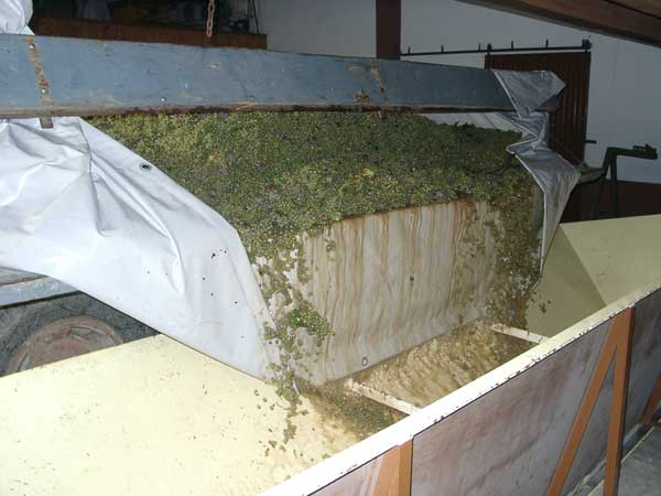 Zuhause werden die frisch geernteten Trauben vom Hänger in einen großen Trichter abgekippt. Sie werden von dort mit einer Schnecke in die Maischemühle im Keller transportiert.