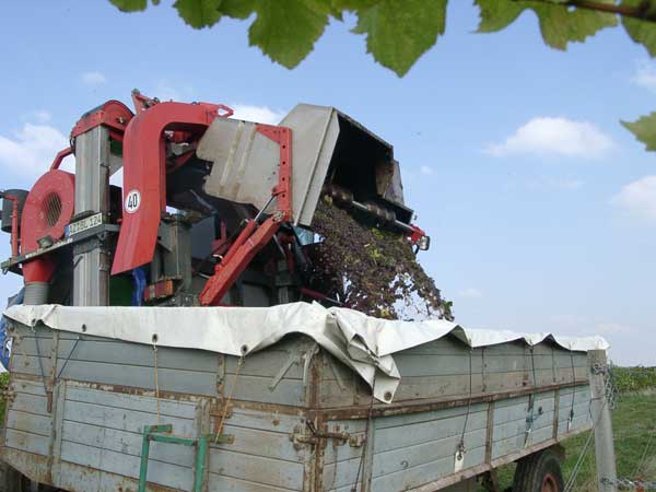 Während des Erntevorgangs sammelt die Lesemaschine die Beeren in einem großen Behälter, der hier zum Weitertransport nach Hause auf einen Anhänger ausgeleert wird. Der Anhänger ist mit einer wasserdichten und lebensmittelechten Spezialplane ausgekleidet.