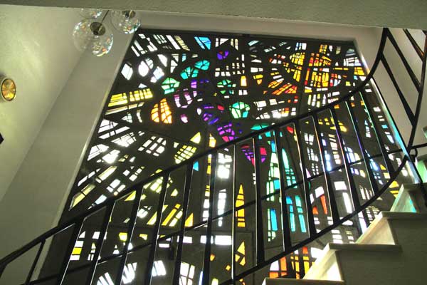 Das Weinfenster ist ein großes Mosaik. Die farbigen Glasteile zeigen ein stilisiertes Weinmotiv: Der gelb-orange Kreis rechts oben symbolisiert die Sonne. Ihr gegenüber in hell- und dunkelblau fällt der Regen auf das grüne Laub des Rebstocks.