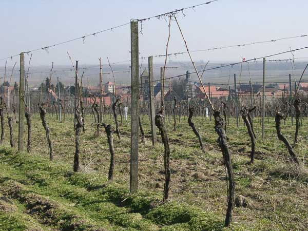 Nach dem Rebschnitt bleibt ein Trieb an jedem Rebstock stehen. Er wird zu einem flachen Bügel gebogen und angebunden, damit der Austrieb gleichmäßig verteilt wächst.