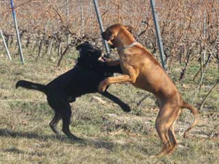 Man merkt es diesem Hund sehr deutlich an, dass ein Ridgeback an seiner Erziehung mitgewirkt hat; er ist für einen Labrador eher vornehm-zurückhaltend und ein guter Wächter.