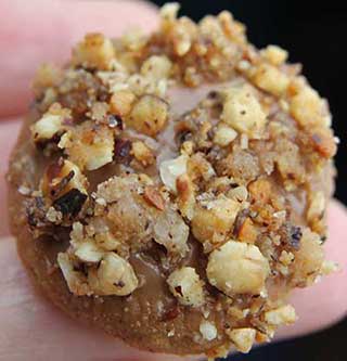 Als Abhilfe bereitete ich schließlich einen Haselnusskrokant zu, mit dem ich die Oberseite der Plätzchen quasi “panierte”. Sie sind jetzt immer noch ein wenig klebrig, aber zumindest stapel- und verpackbar … und die Krokantkrümel verleihen ihnen den geschmacklichen Extrapfiff.