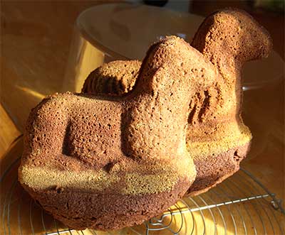 Die Backform sorgfältig fetten, mit Weckmehl oder mit feinen Haferflocken ausstreuen. Besonders bei den Lammformen ist es wichtig, daß die Form komplett gefettet und bestreut ist, damit der zarte Teig nicht hängenbleibt.