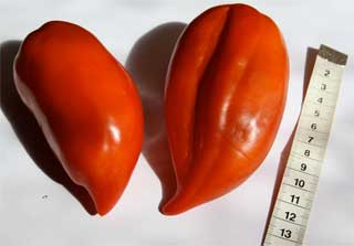 Die eigenwillig, nämlich hornartig geformte Tomate wird sehr groß; sie bringt es leicht auf etwa 12–15 cm Länge.