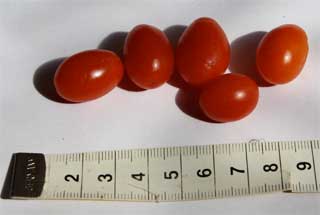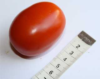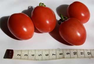 Die längliche Eiertomate ist im vorderen Teil bauchig geformt und trägt eine deutliche Spitze. Die Früchte werden im Durchschnitt 6–8 cm lang. Sie sind festfleischig und von sehr gutem Geschmack.