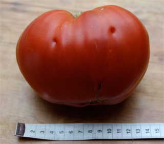 Die Früchte sind sehr groß, manche herzförmig, andere sehr breit geformt. Die rechts abgebildete Tomate war bisher die größte mit 732 g Gewicht und 39 cm Umfang.