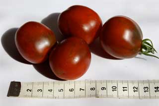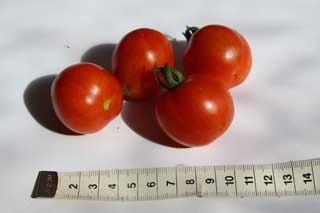 Eine kleine, runde Tomate, die in ihrer Färbung (beschrieben wird sie als “tiefrot”, vielleicht liegt’s an unserm Boden?) eine deutliche orange-rote Marmorierung aufweist.