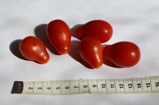 Die birnenförmigen Tomätchen schmecken sehr aromatisch. Sie färben etwas ungleich durch und müssen daher lange genug am Stock reifen dürfen. Bei feuchtem Wetter neigen die dünnhäutigen Früchte leider etwas zum Platzen.