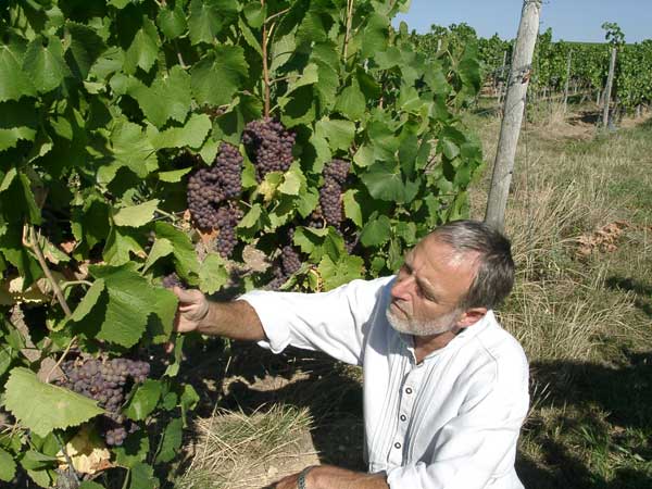 Hans-Jakob Fuchs checks the ripeness of Pinot Gris grapes.
