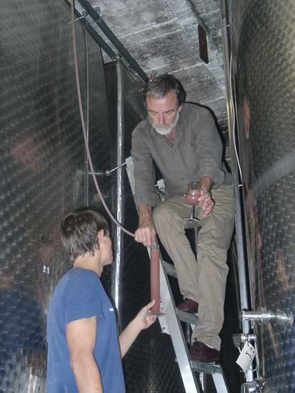 Hans-Jakob Fuchs fills the fermentating must into a glass cylinder.