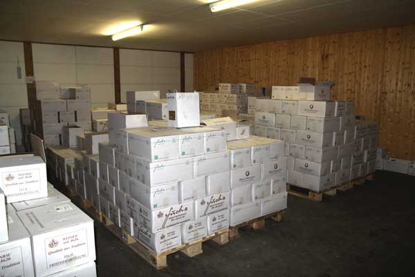 In this part of the temperature-controlled storehouse the labelled and packed wines are stored on pallets.