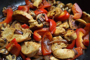 Paprika und Pilze putzen und in Stücke schneiden, in die Pfanne geben.