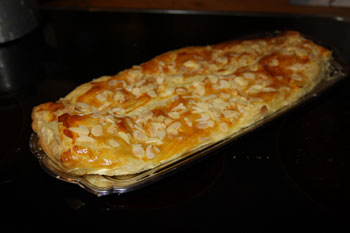 Das zweite Eigelb mit 1 EL Verjus mischen und den Strudel damit bepinseln, mit Mandelplättchen bestreuen.