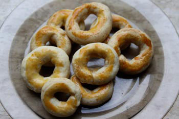Auf einem bemehlten Brett kleine Teigstücke rollen und zu Kringeln formen. Eigelb mit Verjus verrühren und die rohen Kringel damit bepinseln.