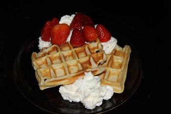 Den Teig im Waffeleisen nach Vorschrift backen, eventuell mit Puderzucker bestäuben.